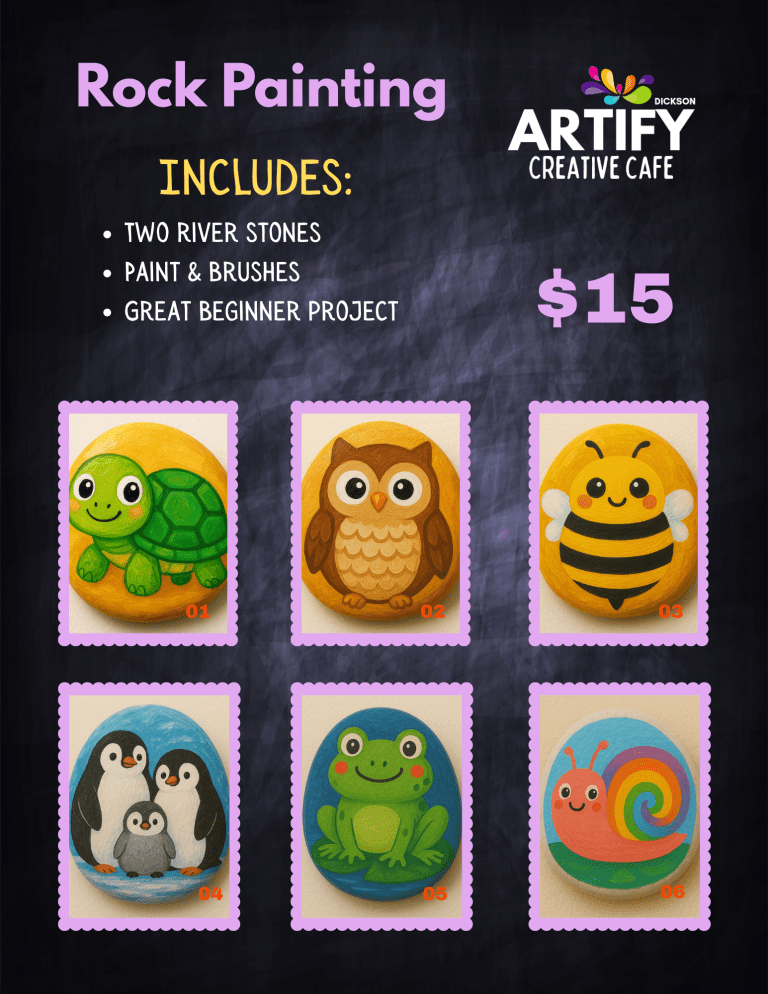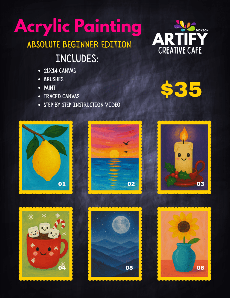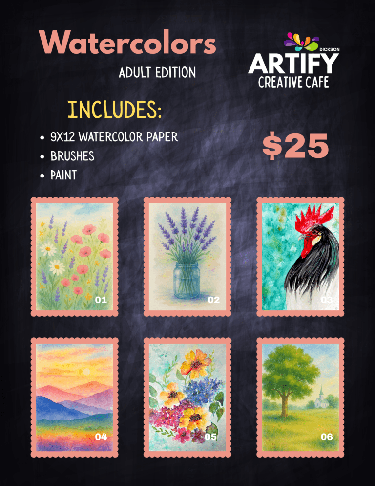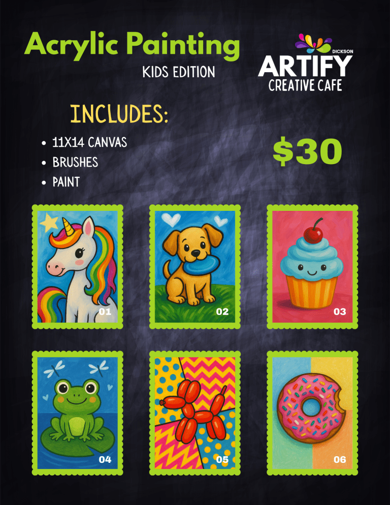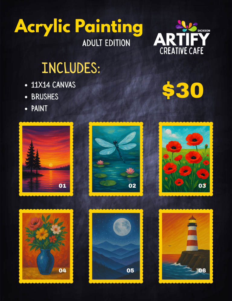 We’re proud to be part of the Dickson, TN community, supporting local eateries by offering snacks and treats alongside your art experience. Our mission is to create a space where friends can gather, families can bond, and individuals can recharge—all through the joy of creativity. Come join us at Artify Creative Café and discover how easy it is to find your creative bliss.