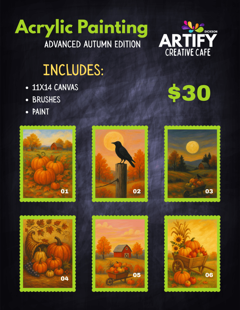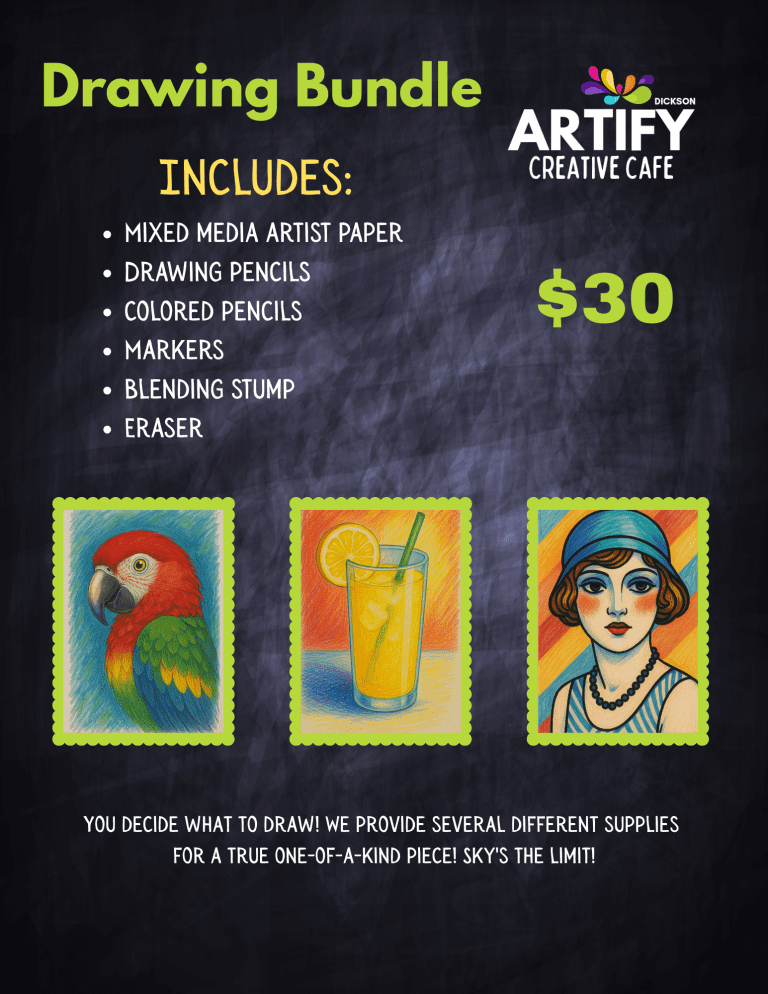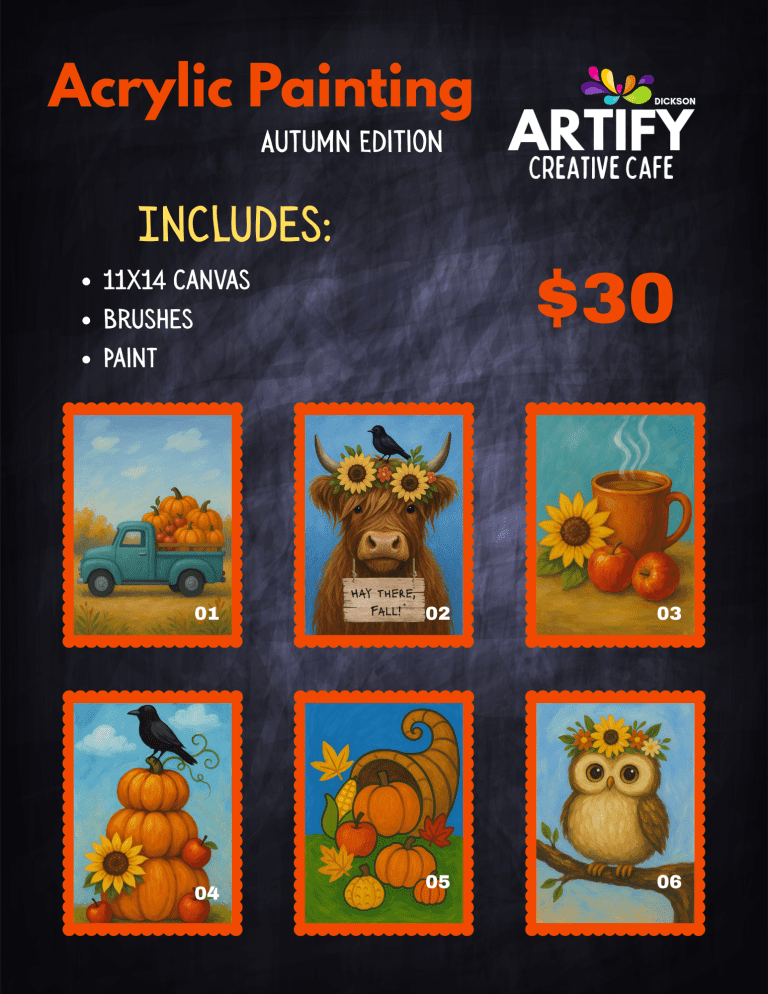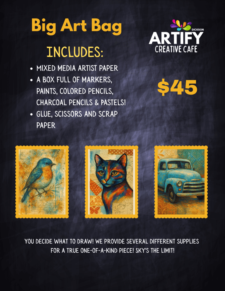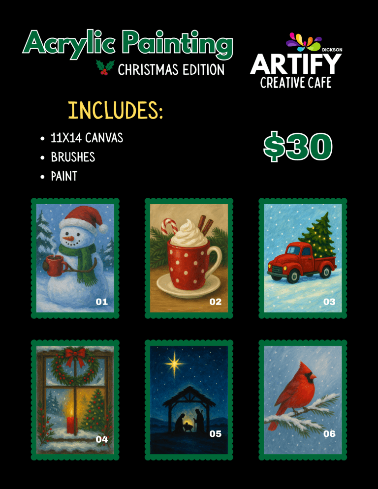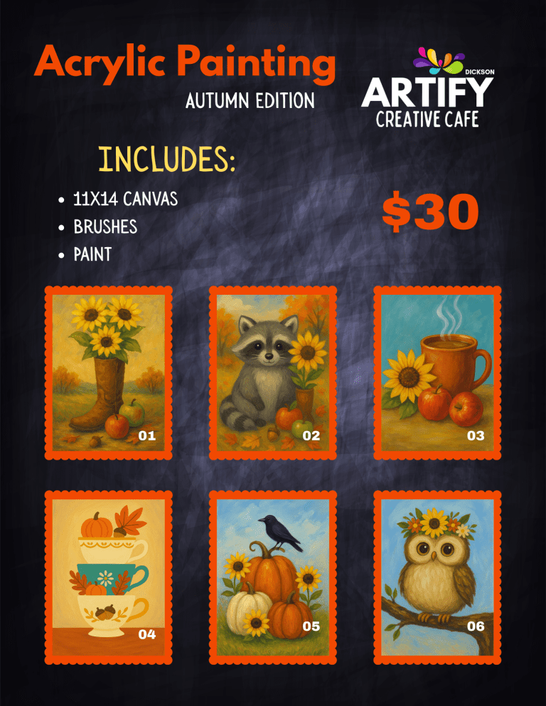 We’re proud to be part of the Dickson, TN community, supporting local eateries by offering snacks and treats alongside your art experience. Our mission is to create a space where friends can gather, families can bond, and individuals can recharge—all through the joy of creativity. Come join us at Artify Creative Café and discover how easy it is to find your creative bliss.