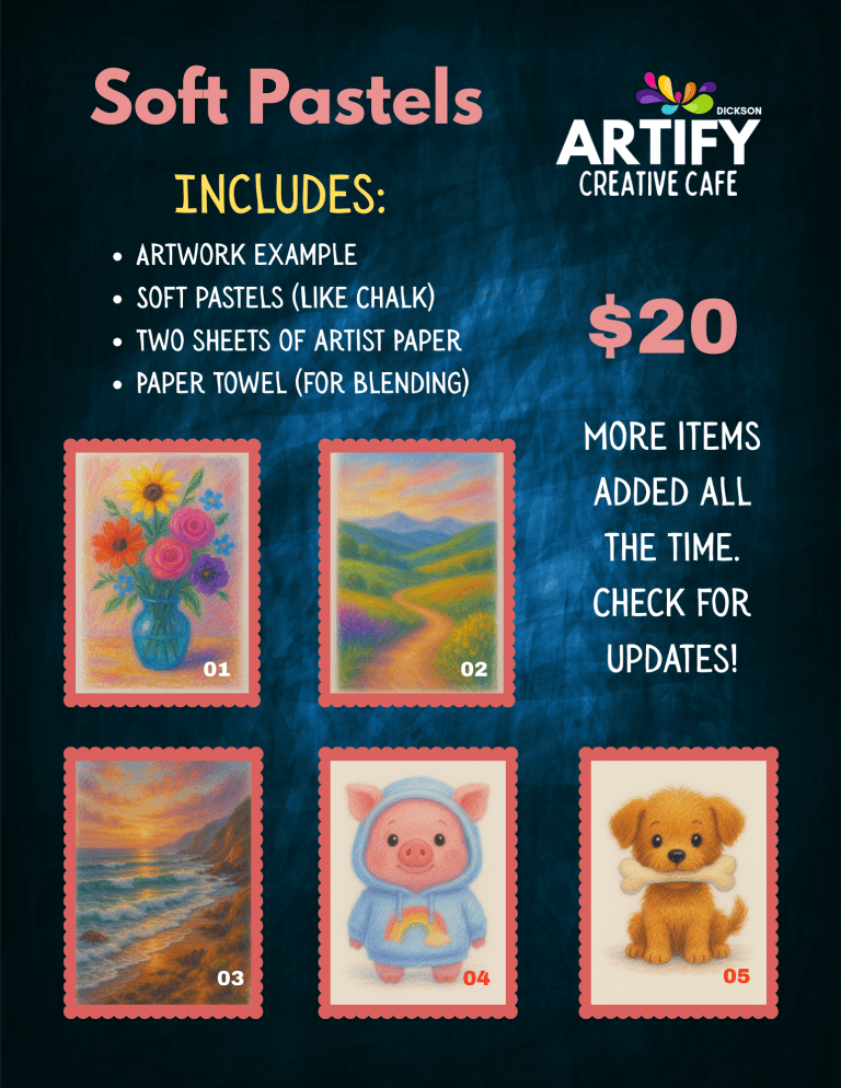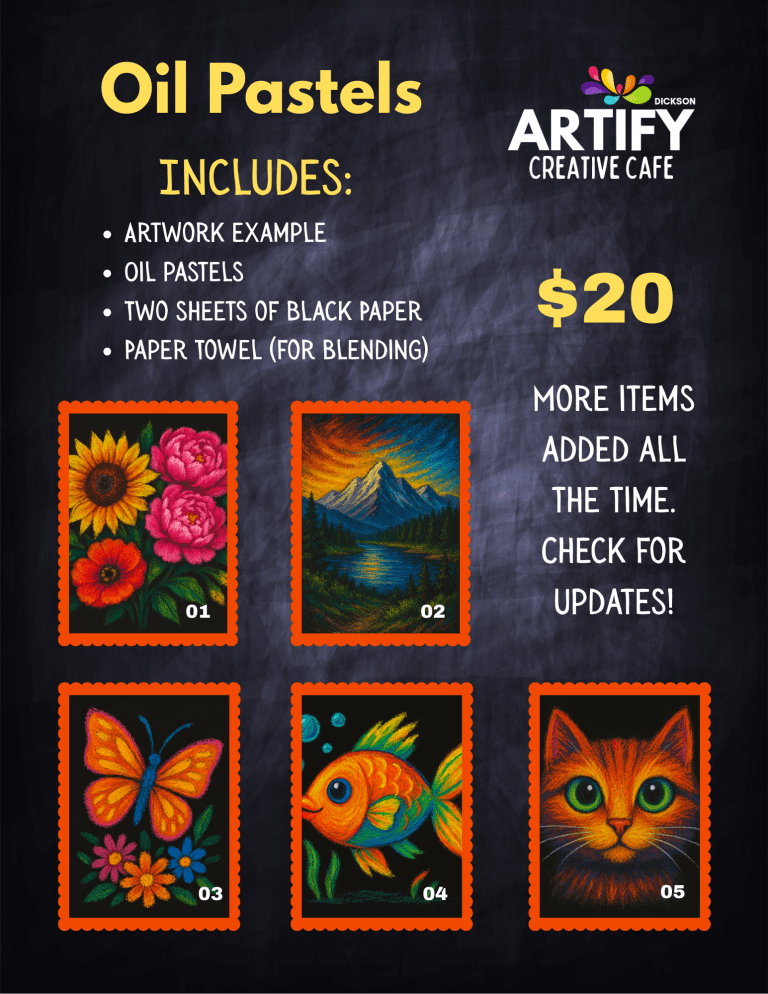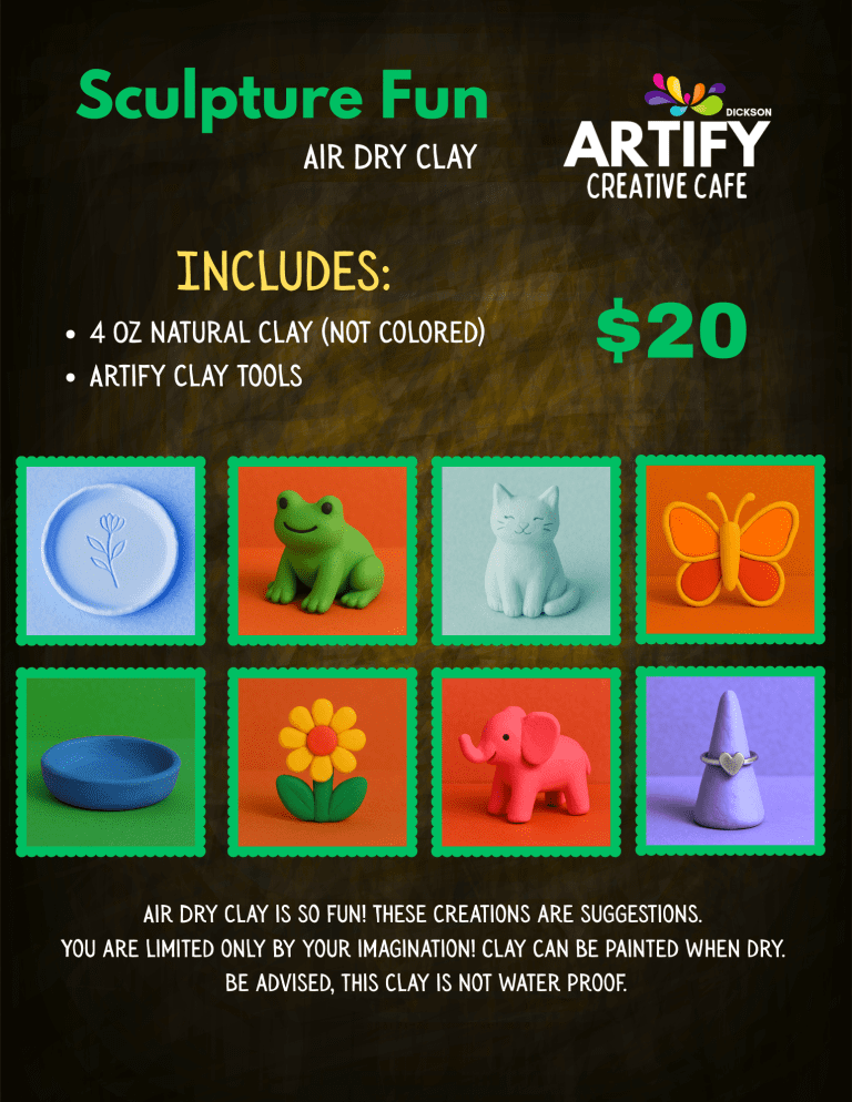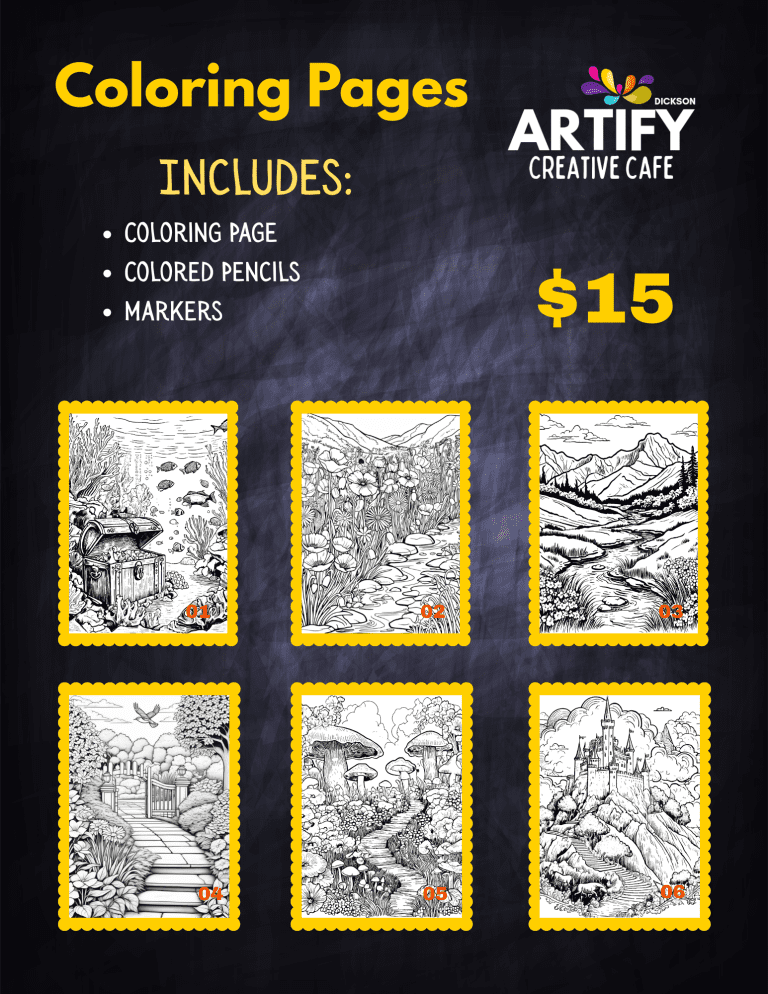 Come on out and step into a world where art is on the menu! At Artify Creative Cafe in Dickson Tennessee, you’ll find two hours of pure creative escape – painting, drawing, clay, pastels, puzzles, and more. Choose your project, settle in with snacks from local eateries, and enjoy self-guided creativity in a cozy café setting. Affordable, relaxing, and fun for ages 10 through adult, Artify Creative Cafe is perfect for a girls’ night out, date night, or simply a little time to yourself!